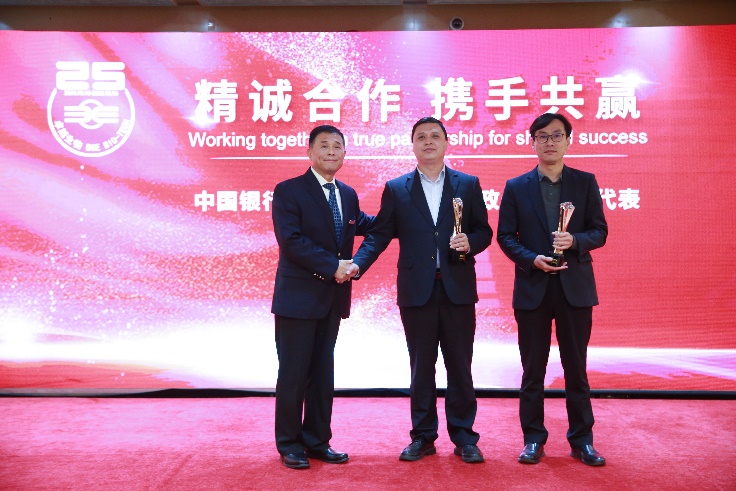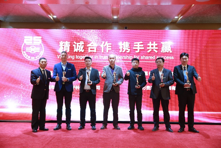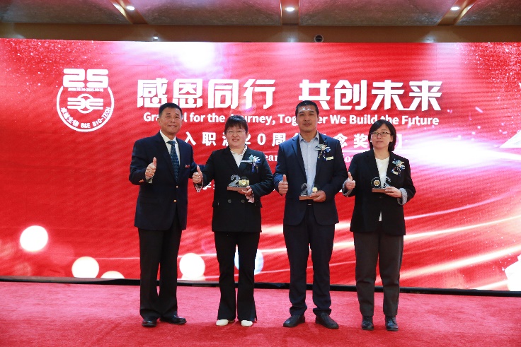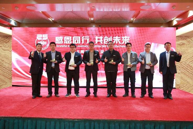 在隆重的頒獎(jiǎng)環(huán)節(jié)中,公司先后為到場(chǎng)的10余家國(guó)內(nèi)外經(jīng)銷商代表、6家供應(yīng)商代表以及2家銀行代表頒發(fā)了“精誠(chéng)合作 攜手共贏”獎(jiǎng)杯,感謝他們多年來(lái)的信賴與支持;隨后,為入職滿10年及以上的6名員工代表頒發(fā)了公司成立25周年紀(jì)念獎(jiǎng)杯,致敬他們與企業(yè)風(fēng)雨同舟的堅(jiān)守與奉獻(xiàn);更特別為入職滿20周年的3名員工頒發(fā)了入職20周年紀(jì)念獎(jiǎng)杯以及20g純金紀(jì)念幣,以表彰他們與企業(yè)共同成長(zhǎng)、并肩奮斗的赤誠(chéng)之心。